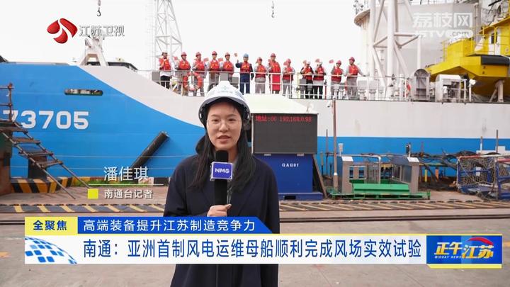 南通台记者潘佳琪:“这里是振华重工启东海工码头。在我身后,‘至臻100’亚洲首制海上风电运维母船完成风场实效试验。通过试验,充分验证了这艘船的各项实战性能。”