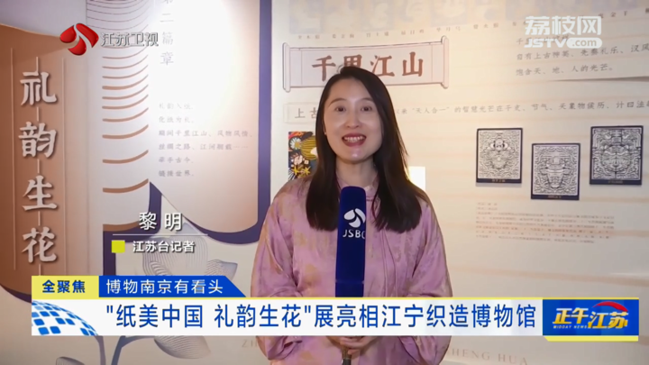 江苏台记者黎明:“造纸术是中国四大发明之一,它推动了人类文明发展进程。‘纸美中国 礼韵生花’展览从‘纸’‘礼’‘花’三个维度,蔚为大观地呈现了中国的千里江山、风物风情、美美与共。”