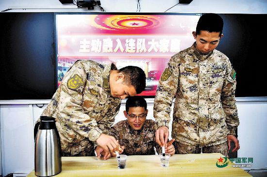指导员苏童(中)和战士们一起做实验。 周泽来 摄