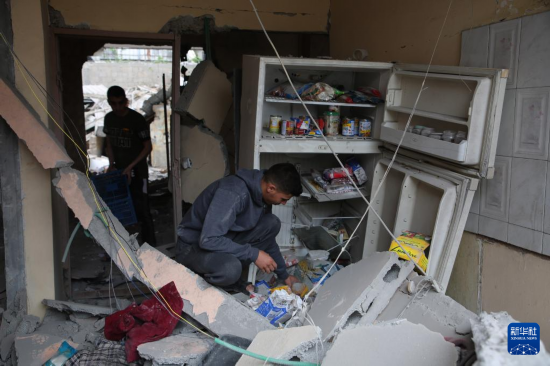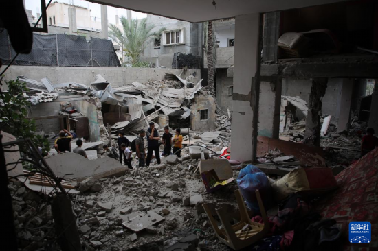 4月27日,在加沙地带南部城市拉法,巴勒斯坦人查看以军空袭后的废墟。新华社发(哈立德·奥马尔摄)