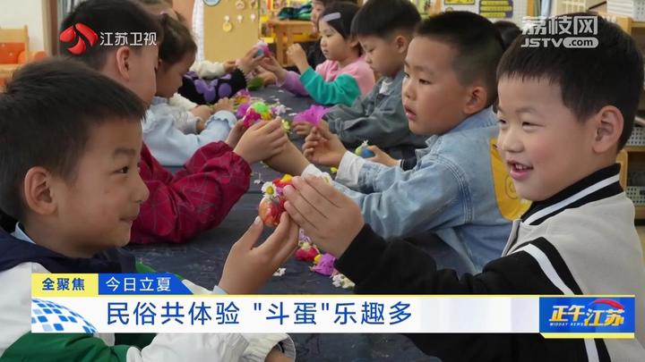 俗话说:“立夏蛋,满街甩”。立夏这一天,最好玩的民俗莫过于“斗蛋”了。在淮安生态文化旅游区沁春路幼儿园,一场“立夏斗蛋”比赛正在举行。将煮熟的鸡蛋放入用彩绳编织的蛋兜中,挂在胸前,“斗蛋“的时候需要头对头、尾对尾,一旦蛋碰在一起,就只能相互推挤,不能大力去敲击。在推挤的过程中,最终一方完好无损的蛋,就是最后胜出的“蛋王”了。