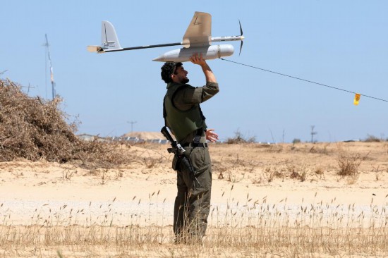 5月8日,在以色列南部凯雷姆沙洛姆口岸附近,一名以军士兵准备放飞无人机。新华社发(伊兰·阿萨亚格摄/基尼图片社)