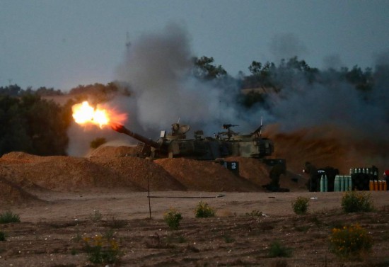 5月8日,在以色列南部凯雷姆沙洛姆口岸附近,一门以军自行火炮向加沙地带开火。新华社发(贾马尔·阿瓦德摄)