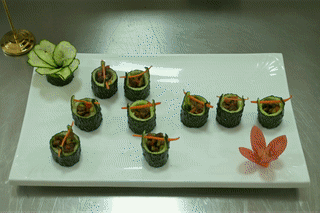 各位大厨纷纷拿出看家本领、亮出绝技;现场观众看得眼花缭乱、目不暇接。霎时间,比武场上香味弥漫,不一会工夫,一道道美食就烹制完成。现场评委认真对各个菜品进行品尝。