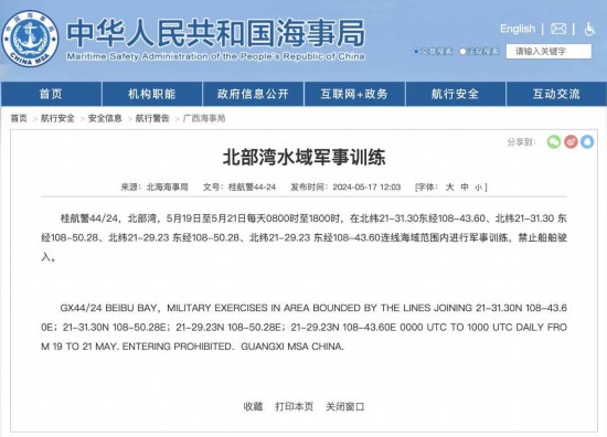 北海海事局发布航行警告,5月19日至5月21日每天8时至18时,北部湾部分海域进行军事训练,禁止驶入。