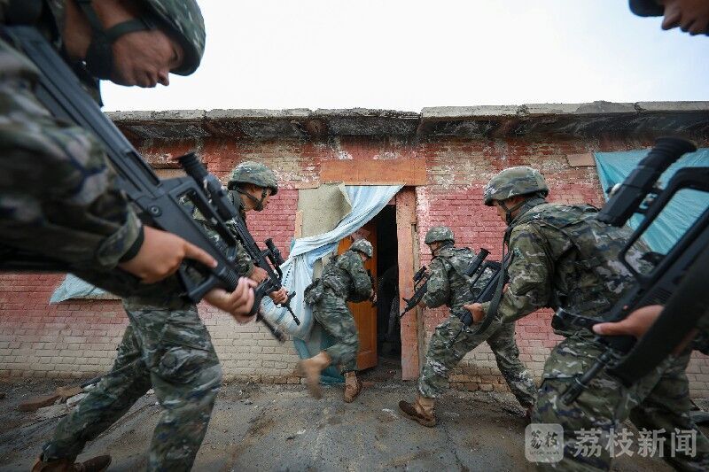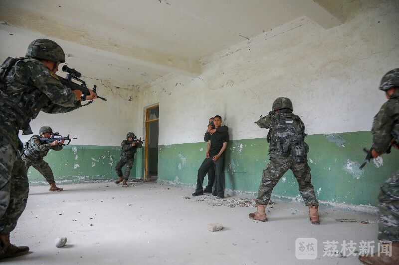 “据公安机关通报,现有1名‘暴恐分子’劫持1名‘人质’藏匿于西北方向200米一所废旧工厂内……”5月21日下午,武警新疆总队克拉玛依支队一场模拟实战环境下楼房反劫持演练在某陌生地域打响。