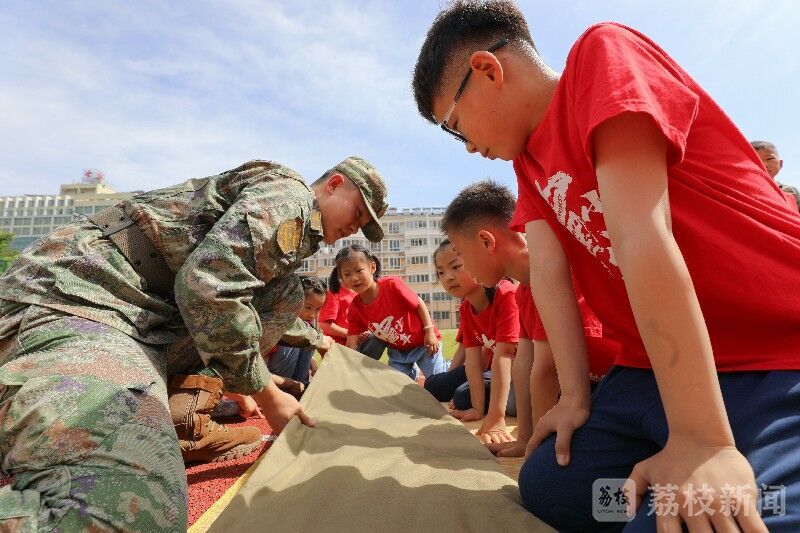 参观叠军被,孩子们惊讶于军营里方正平整的“豆腐块”,“先铺平整后再对其用手按压,捏出棱角......”军娃们跃跃欲试,认真学习叠军被的方法。