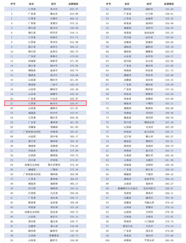 日前,由人民日报社属《中国城市报》主办的2024城市品牌论坛在北京举行。论坛发布了2024全国地级市城市品牌指数百强,江苏共有8座城市上榜,扬州排名全国第21。