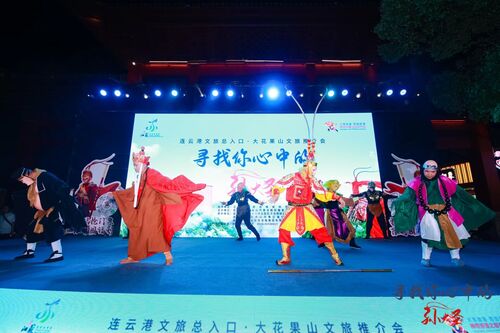 活动在西游古风舞蹈《云宫迅音》中拉开序幕,跟随古典名著《西游记》打卡大圣故里连云港,从“交通之便”“文化之美”“山海之美”到“物产之美”等多个方面全面介绍了景区文化旅游资源,从“一部西游未出此山半步”的花果仙山到“神鱼化龙跃上青云”的灵山秀水渔湾,从“十大美丽海岛”之一的连岛到“四季流水潺潺的小众秘境”孔雀沟景区,向现场嘉宾展现了西游文化熠熠生辉的山海辽阔多彩画卷。活动中,西游巡演组为南京市民朋友带来了《猴王降世》《女儿情》《大王叫我来巡山》《撞天婚招女婿》等精彩纷呈的歌舞表演,惟妙惟肖的西游情景演绎赢得了现场热烈的掌声。