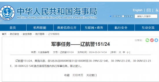 大连海事局发布航行警告,5月26日8时至31日18时,黄海北部部分海域执行军事任务,禁止驶入。