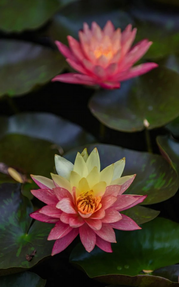 此种花开两色的莲花品种属于“万维莎”,万维莎花色变化无规律可循,即便是同一株万维莎,也有可能会开出颜色不同的两种花;一株同色、一株多色、一花多色都有可能,所以有着“百变女王”的称号,是睡莲界的佼佼者。