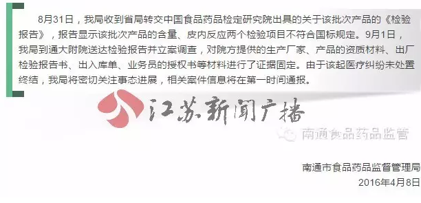 4月8号,南通市食品药品监管局通过其官方微信向外界发出情况通报。