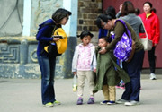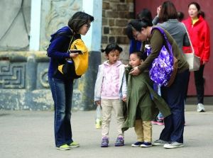 昨天气温较低,冷风中,大人脱下自己的外套给孩子穿上 现代快报记者 赵杰 摄