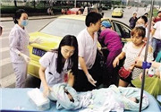 听到有人呼救,快速了解情况后,急诊科抢救室护理责任组组长刘海燕连忙推着担架车往外赶。同时,护士马誉芹立即电话联系妇产科和儿科医护人员赶往现场。