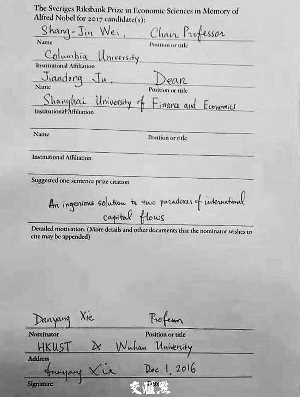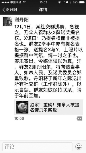 网站上还有一张署名“谢丹阳”的网友发帖的截图。上面写道:“12月1日,某社交群沸腾,急视之,乃众人祝群友X获诺奖提名权。X谦曰:乃提名权而非被提名也。群友Z幸手中亦有提名表格一张,遂提名X与Y,上照片以提振群中气氛,博一时之乐也,实未寄出。”文中还称,“今媒体误以为真……特向诸当事人、如皋人民、及诺奖委员会郑重致歉……”