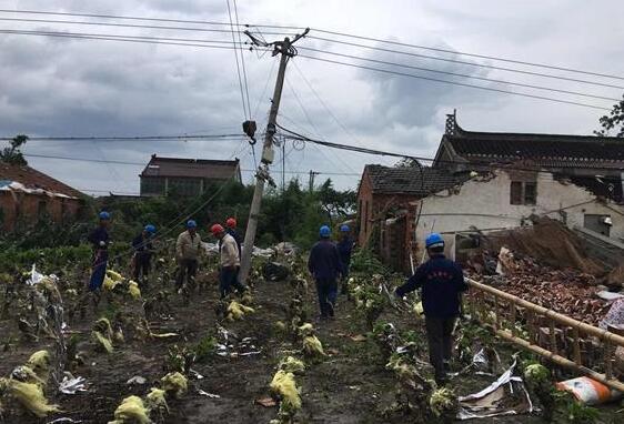 盐城东台遭强对流天气 电力部门加紧抢修