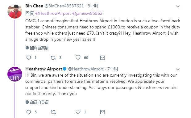 网友@Bin Chen:我的天哪!真难以想象希斯罗机场是这样背后捅刀子的双面人。中国人要花1000英镑才能在免税店拿到一张优惠券,其他人就只需要79英镑?疯了吧?!嘿,希斯罗机场,祝您新年业绩大跌!