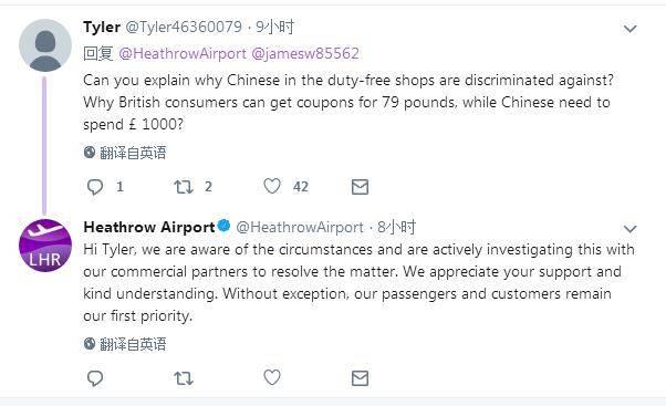 【环球网报道记者张骜査希纪双城】2月11日凌晨(北京时间),有自称在伦敦希斯罗机场第二航站楼免税店打零工的中国留学生爆料称,该免税店在价格上区别对待中国消费者,要求中国客人必须付1000英镑才能领取优惠券,而外国人只需付79英镑,“把中国人当猴耍”,此事引起网友的关注;2月11日下午4点左右(伦敦时间上午8点)希思罗机场官方推特发布了一条“早安贴”,但是其留言区被大量网友挤爆,网友纷纷留言质疑其这种行为,希思罗机场随后发布40多条留言回复网友,不仅进行了道歉,而且还承诺进行调查改正。