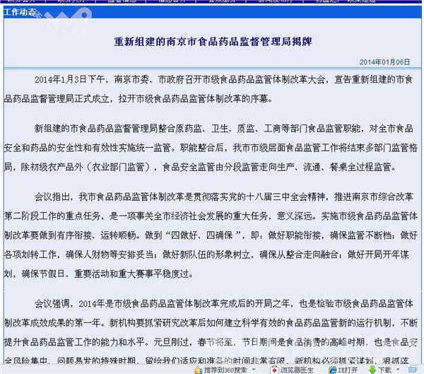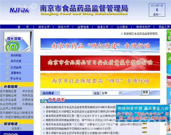 近日,南京市委、市政府召开市级食品药品监管体制改革大会,对食品药品监管体制进行改革,新组建的南京市食品药品监督管理局整合原药监、卫生、质监、工商等部门食品监管职能,对南京市食品和药品的安全性和有效性实施统一监管。职能整合后,南京市市级层面食品监管将结束多部门监管格局。除了初级农产品还由农业部门监管之外,食品从生产、流通、到走向餐桌将由新建的南京市食品药品监督管理局全过程监管。也许以后查处一个小作坊就不要工商、卫生、质监和药监一起找,一个食药监就能搞定。另外提醒,南京市食品药品监督管理局网址也已经改变!原网站域名www.njfda.gov.cn一个月后停用,请使用新域名: fda.nanjing.gov.cn。