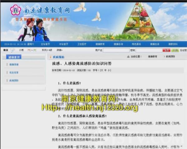 目前的流感疫苗对H7N9和其他禽流感病毒尚无明显效果,但是可以减少接种者同时感染流感病毒和禽流感病毒的机会,从而减少两种病毒在体内重组出现毒株流行的机会。另外,疾控部门通过南京健康教育网,发布了人感染禽流感防治知识问答,市民也可以登录了解。(字幕:南京健康教育网Http://health.nj12320.org)