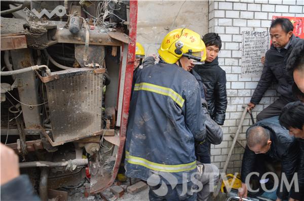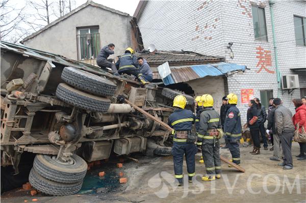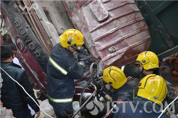 消防官兵和当地民警把卡车上的货物清除,而后用一辆吊车和一辆卡车进行起吊与牵拉,将事故卡车成功被从房屋里拉出,消防官兵随后用液压剪扩器对事故卡车进行破拆,经过约两个半小时的救援,成功把被困人员救出。