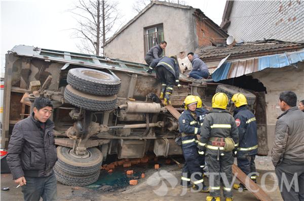 据了解,一辆卡车在十字路口右转时,由于雨天路滑,转弯不及时侧翻撞入房屋里,卡车身下压着一辆小轿车,卡车司机被卡在车里,小轿车里没有被困人员。消防官兵接警后立即赶往现场,经现场急救人员诊断,驾驶员意识清醒,暂无生命危险。