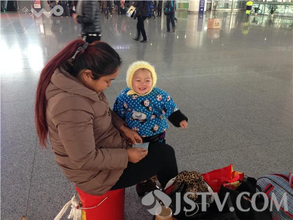 高铁南京南站的客流熙熙攘攘,即将踏上回河南老家列车的杨女士抱着孙子浩浩,安静地坐在候车大厅中央,身边还有一大堆行李。