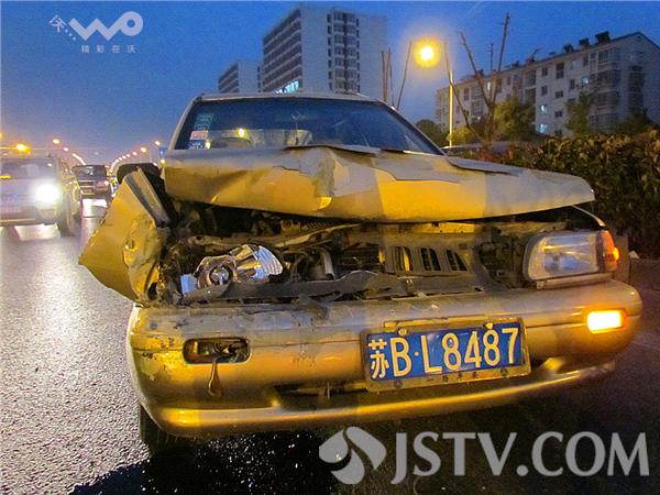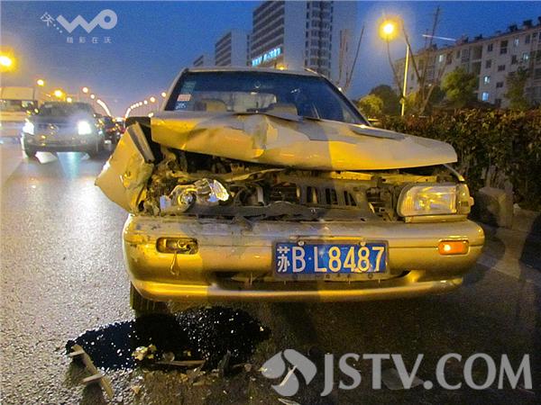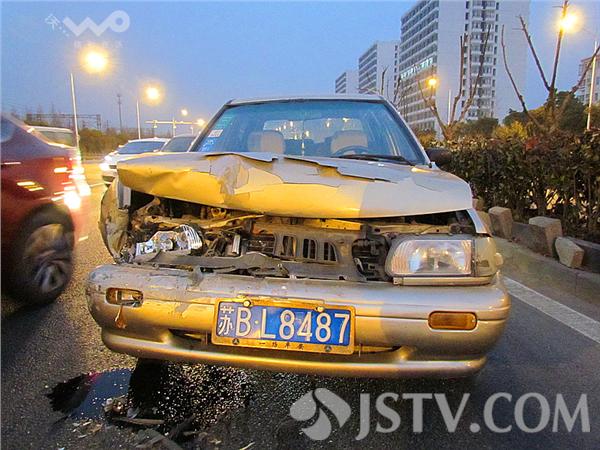 笔者赶到现场时,两辆车已经撤到了路旁边,其中第三辆苏B-L8487轿车因为车头受损严重不能离走,前脸撞坏,轿车引擎盖弯曲变形,右小灯、大灯粉碎,发动机漏油。那怎么会突然追尾的呢?笔者了解到,三车追尾中,当时第一辆轿车躲避前方轿车急刹车后,后车避让不及,导致了追尾。三辆车不同程度损毁,其中,外地轿车由于车速较快,一头将中间马自达撞击顶上前方,再撞上头车后保险杠。车头变形,一名男性乘客坐在副驾驶座上,撞到胸部,送往医院检查。