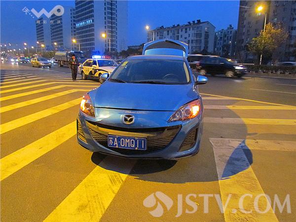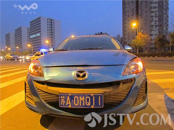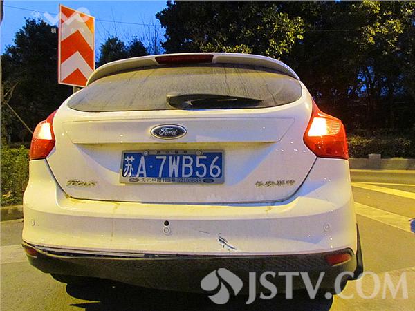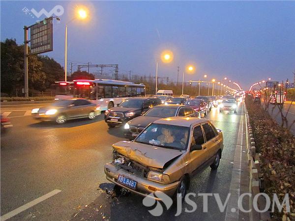 据了解,第一辆苏A-7WB56长安福特由东向西行驶至南京玄武大道跨线桥(花园路)下桥口附近,为了躲避一辆前方轿车情况,急刹车;紧跟其后的一辆苏A-0MQ11马自达紧急刹车;刚停下不到半分钟,后面一辆苏B-L8487牌照快速行驶的轿车避让不及,一头撞上了上去。马自达前后夹攻,车前头顶了长安福特后保险杠。徐福庚 摄