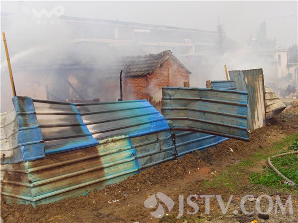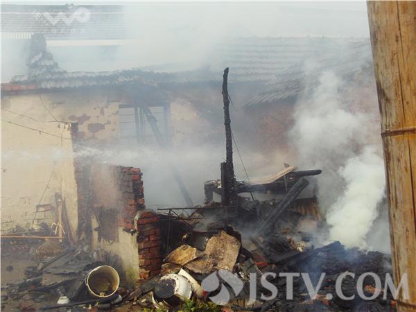 在院子里我们看见用铁皮做的围墙也被烤裂,家里的几袋稻谷也被烧焦,两间房屋也被烧成废墟,厨房里的两个煤气罐也被烧坏,所幸消防及时用冷水浇灌没有发生爆炸,院子里一片狼藉。