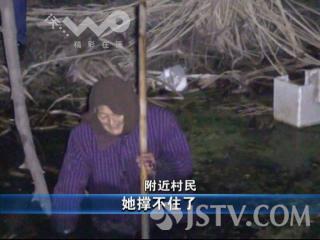 记者随消防赶到时看到,一位老人撑着竹竿站在水里面,在身后的岸边,一位村民递着一根木棍,让老人握着,防止她进一步陷进去。