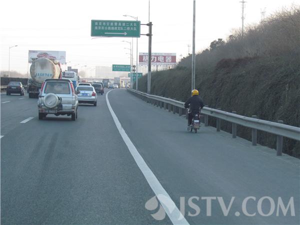 每年高速公路撞死行人事故都不少,然而在南京二桥高速上,行走、骑车人纷纷上高速,疾驶的车辆从她身边经过,十分危险。由于行人上高速对交通安全威胁大,《中华人民共和国道路交通安全法》明确规定,禁止行人上高速。