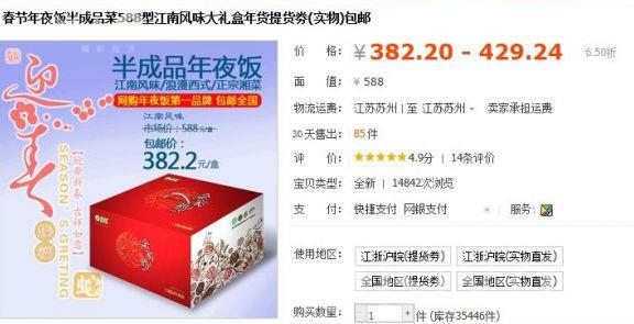 在淘宝网上搜索“年夜饭半成品”,各类礼盒立即跃然眼前。根据食材和菜肴丰富的程度不同,价格从一二百元到一两千元不等,在这些年夜饭半成品礼盒套餐里,冷菜、热菜、汤类、甜点、水果等一应俱全,买家只需经过简单的加热、炒制就能做出一桌色香味俱全的丰盛年夜饭。据了解,像这样的“半成品年夜饭”,一些酒店也有提供,并且可以根据客人的需求,专门进行定制。