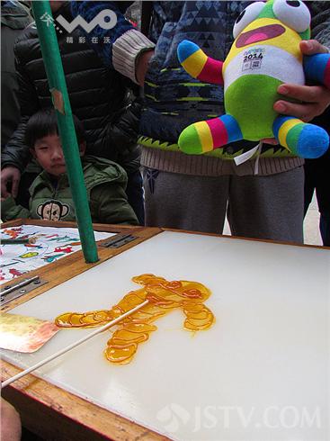 这门手工艺曾经流行于冬季的街头巷尾,而今却慢慢消失于大众的视线。在南京夫子庙老门东一个糖画小摊上的生意却很红火,糖画艺人的卡通糖画,尤其是受到很多小朋友的欢迎。在他的作品中,HELLO KITTY、喜羊羊、机器猫等系列卡通造型已成了招牌,在马年最先“火”了起来。糖画摊上各种图案造型的作品价格不一,从10元至30元不等。例如较为受市民喜爱的“龙”造型价格为30元。在传统的十二生肖等糖画作品基础上,他与时俱进创作出福娃、喜羊羊等糖画品种,甚至连2014年南京青奥会的“砳砳”,全程不到2分钟一个糖画作品便完成,交到了路人手中广受市场欢迎。