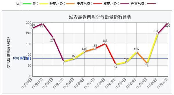 2014年02月01日(大年初二)16时,江苏淮安,空气质量重度污染。据PM2.5监测网的数表明,淮安春节期间PM2.5值急剧上升,空气质量出现明显恶化。节前,淮安市大气办、市环保局曾通过媒体向广大市民发出“文明燃放烟花爆竹过环保大年”的倡议,但是实际效果并不明显。即使是在偏远的乡村的田边路头,也随处可见爆竹燃放留下的残渣。