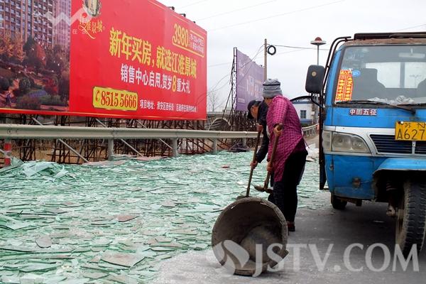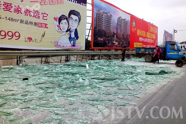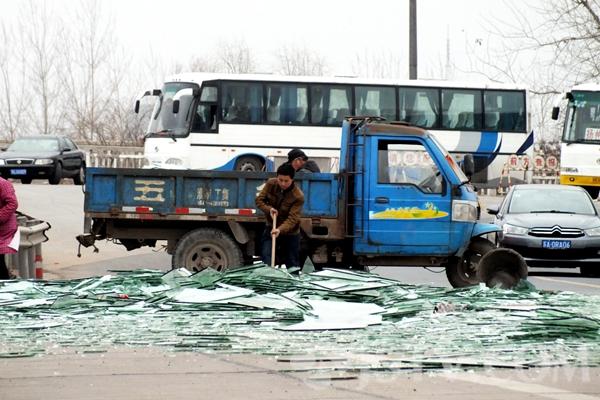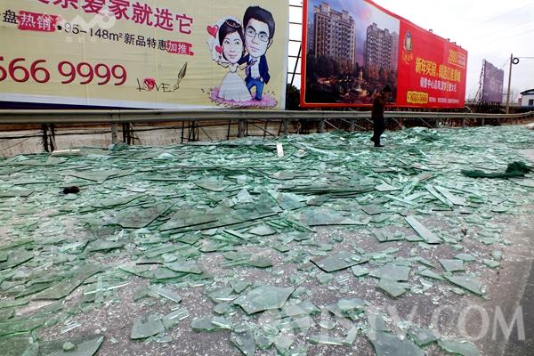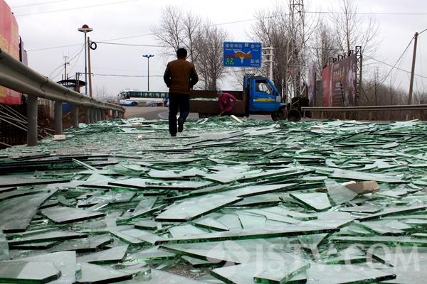 2014年02月03日,大年初四,江苏淮安运东闸省道S237与S328重合段,近百米的路面上散落着白花花的碎玻璃,总重量在20吨以上,过往车辆纷纷避让,地方村民以有偿回收玻璃渣的方式帮助清理。