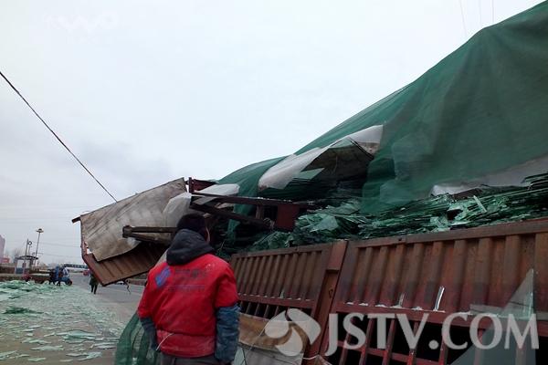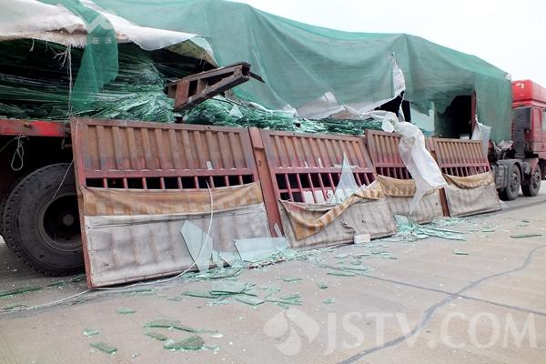 上午7:35,一辆由山东开往江苏扬州的大货车,行驶至江苏淮安运东闸地段拐弯下坡时,由于钢丝揽胜断裂,车上的数十吨玻璃压垮右侧车厢,顷刻间散落近百米长的路面。所幸未伤及行人和其它车辆。