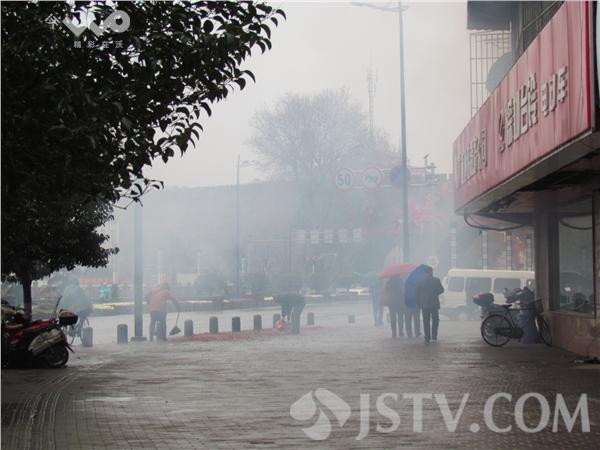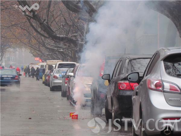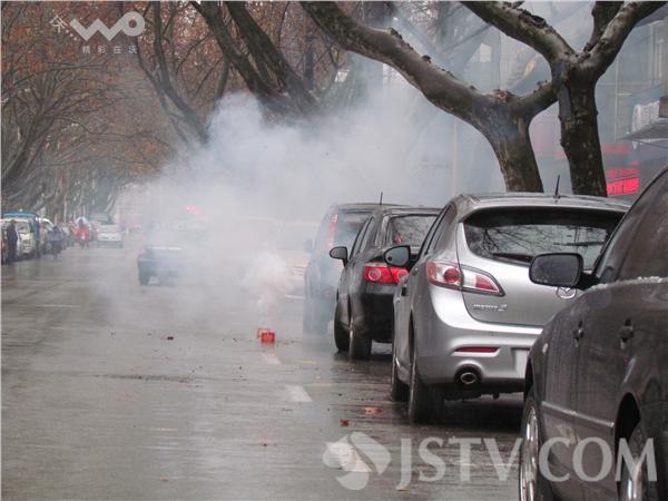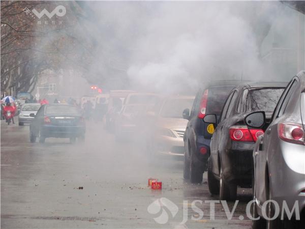 沿着街头一路走,至少有七八家商家在燃放烟花爆竹,鞭炮声此次彼伏震耳欲聋。上午9时许,在长乐路一车行门口看到,人行道点燃后劈啪作响,浓烟四起,过往行人无不捂住口鼻小跑绕行。江宁路一店家竟然在快车道上整整齐齐摆放几盒冲天炮,点燃后劈啪作响,浓烟四起,烟花炸得满地都是。只见天空一片灰蒙蒙的,空气中那火药味呛得肺里面真的不好受。加上今天又是雨雪天,地面上湿乎乎的,鞭炮残屑与雨水混合在一起,扫不干净。徐福庚7日摄