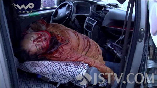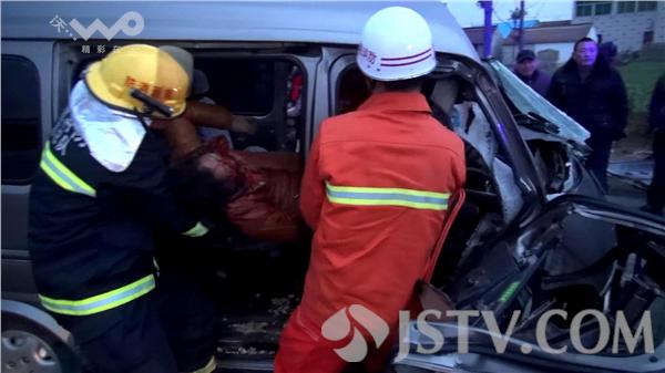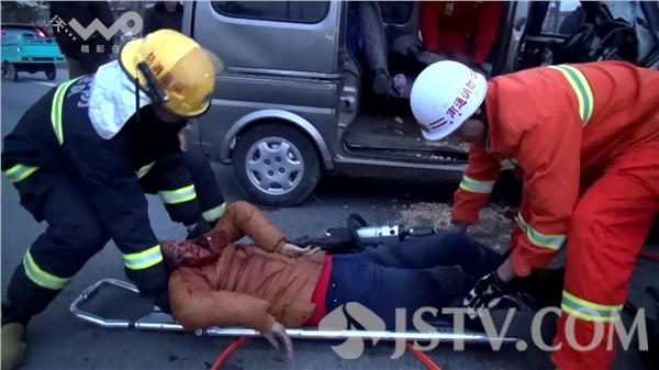 在事故现场,一辆面包车斜停在马路边,面包车损坏较为严重,车头已面目全非,玻璃、零件散落一地,一名身着红色外套女子被困在副驾驶位置上,满脸血迹。双腿被严重变形的车头牢牢卡住,无法脱身,路边的一个路灯已被撞弯,倒在树上。当地消防部门在接到报警后第一时间赶到现场进行救援,将被困女子救出。