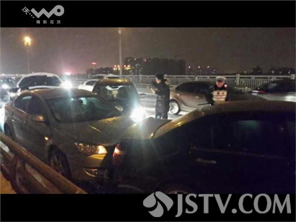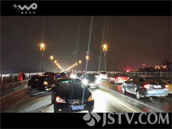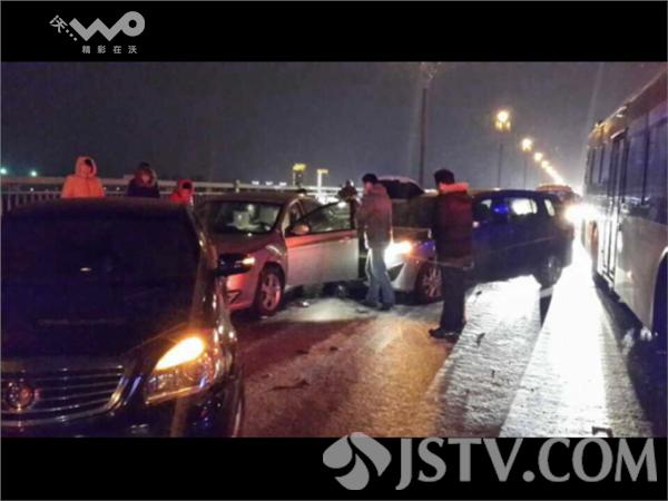 昨天傍晚,南京城陆续开始飘起雪花。这雪景是不错,不过对晚高峰的车辆却造成了一定的影响。晚上七点半左右,在南京长江大桥上,因为路面结冰,容易打滑,有五车发生连环追尾。