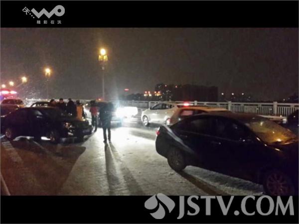 事故发生在由北往南方向的,桥中间位置。五辆轿车发生连环追尾,挤在一起。所幸事发时,车速并不快,仅第二辆事故车的司机受了皮外伤,五辆车不同程度受损。事故占据了该方向仅有的两股行车道。后方车辆不得不借道逆向行驶,大桥交通受到严重影响。一直到昨晚十点钟左右,事故车辆才被清理走,交通恢复正常。桥面因为悬空的原因,空气流动更快,比路面更容易结冰,我们也提醒司机,在通过桥面时,一定要减速慢行,千万不要猛打方向,注意安全。