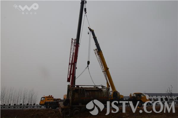 事故地点位于徐溜镇集镇边上,如发生液氯泄漏,极易造成大量群众中毒。现场各救援部门组成临时指挥部进行联合救援,现场的消防队员迅速利用仪器对罐体进行不间断的检测,防止出现泄漏事故,同时公安等部门对周边村民进行紧急疏散。现场指挥部调集了两辆大功率吊车,对事故槽罐车进行起吊作业,先将分离开的槽罐车车头起吊脱离现场,再对罐体进行起吊,同时调来一辆货车车头将罐体拖至厂家对液氯进行卸载。