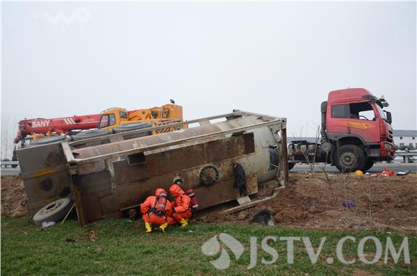 当记者赶到现场时,发现一辆满载液氯的槽罐车侧翻在路基下,车头与罐体分离,部分罐体阀门已陷入泥土中,车上无人员受伤被困。据槽罐车司机反映,当时车上共两人,车子是由淮安开往新沂,罐体内载着23吨液氯,当车子行驶至该路段时,突然后面两辆车子强行超车,自己赶紧往左打了点方向,车子轮胎一下压在路边的软土侧翻。