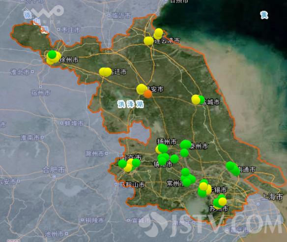 现在看省环保厅的空气质量实时监测平台,一片黄绿色,黄色就代表这空气质量为良好,绿色就意味着空气质量是为优秀,从平台上可以看到,分化非常明显,苏北的空气质量几乎都是为良好,苏南和苏中的空气都是为优秀,今天全省的空气都是非常好的,