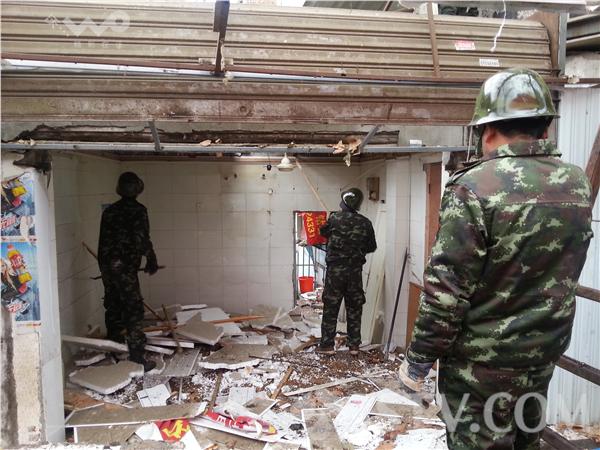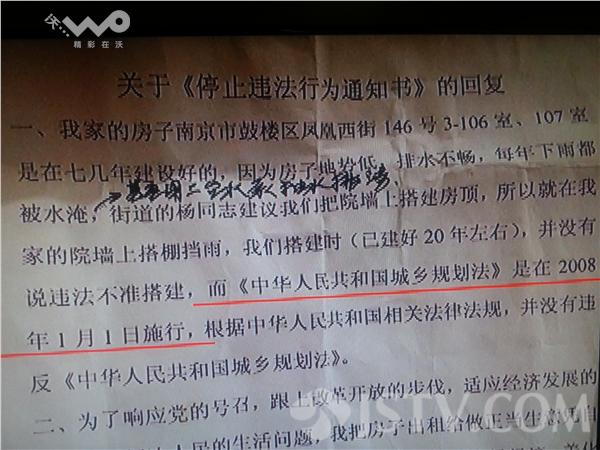 今年春节过后,南京鼓楼区凤凰城管执法中队,对凤凰西街146号小区一楼违建户下发限期整改拆除通知。整改期满后,今天上午,城管执法队组织人员对这排违建门面房实施拆除。拆违工作刚进行不久,承租户马先生代表部分违建业主,拿来一张针对拆违的回复声明。文中指出,违建拆除依据的《城乡规划法》,是08年才修订的,这里的违建属于老违建,并不适用。而且当时搭盖违建也是不得已而为之。马先生说,由于院落地势比较低,以前只要下大雨都会被淹,当时街道的一位杨同志说可以将院落搭盖起来,不仅可以繁荣市场,还能防雨。