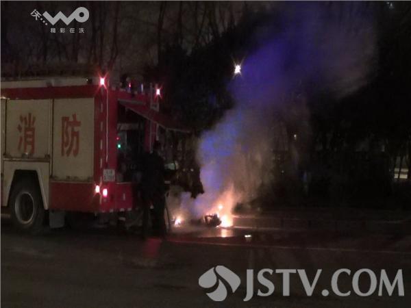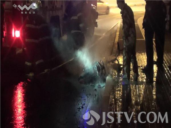 据电动车车人单先生介绍,晚上9点左右,我骑辆航天电力电动车,这辆车是两年前2800元买的,当行驶到鼓楼区三汊河桥口处时,突然电动车冒起了白烟,还散发出刺鼻的气味,我急忙停下电动车跑到道路中间,拦截公交车,因公交车上有灭火机使用,可借没有一辆公交车愿意停下,没有办法只能报警求救。110迅速赶到三汊河桥口电动车起火地方,急忙停下车让市民避开,用二具灭火机快速对准燃烧的电动车喷射,由于火势太大,没有扑灭。又赶紧报119求救,10分钟后一辆消防车赶到现场,1分钟就将其大火被扑灭,但此时电动车已经被烧得面目全非,成了一堆废铁。
