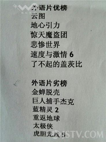 外语片优榜:《云图》,《地心引力》,《惊天魔盗团》,《悲惨世界》,《速度与激情6》,《了不起的盖茨比》。