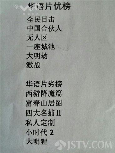 华语片劣榜:《西游降魔篇》,《富春山居图》,《四大名捕2》,《私人定制》,《小时代2》,《大明猩》。