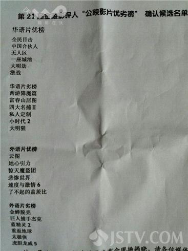 由江苏省影视评论学会发起组织的第21届影评人“公映影片优劣榜”评选活动,3月2日在南京大华电影院放映室举行。本届优劣榜评选活动持续一个多月,由影评人,媒体,观众,网友共同参与,对2013年度中国内地公映的影片发表意见,投票打分,评选出候选名单,而后,金陵影评人根据影片的市场反馈,观众口碑,网络意见等情况,综合打分,最终评选处出优劣榜。候选名单如下。