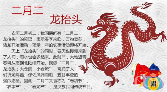 关于民间“二月二”的习俗有很多,由于“龙抬头”期间正是经过冬眠,百虫开始苏醒的时,因此民间有撂刷把子、敲房梁的习俗,以此来驱赶祸害庄稼的害虫。而除了传统的祭龙王、剃龙头之外,还有打仓头的习俗,寓意来年庄家丰收,粮食满仓。此外凡带吃的,这一天都应该带个龙字, 比如吃春卷叫做吃“龙鳞”,吃馄饨叫“吃龙眼”,吃面条叫“扶龙须”,吃饺子叫“吃龙耳”等。